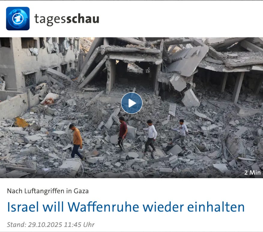 In ihrem Bericht stellt die tagesschau israelische Luftangriffe und zivile Todesopfer in Gaza als routinemäßige Ereignisse dar. Durch das Wiedergeben offizieller Aussagen ohne Prüfung und ohne rechtlichen oder humanitären Kontext verwandelt die Redaktion großflächige Gewalt in politisch neutrale „Handlungen“. So normalisiert die tagesschau staatliche Gewalt und schwächt die Fähigkeit der Öffentlichkeit, die Situation mit vollem Wissen einzuschätzen.