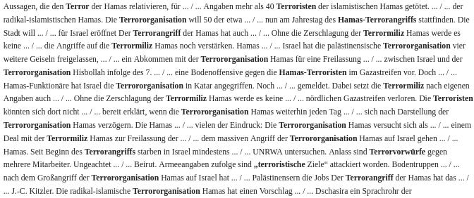 Keyword matching is performed against the combined headline (title) and summary text. For each keyword, multiple terms are considered. For instance, the “Palestine” keyword is matched against any of “Palästina, Palästinenser, palästinensisch”.